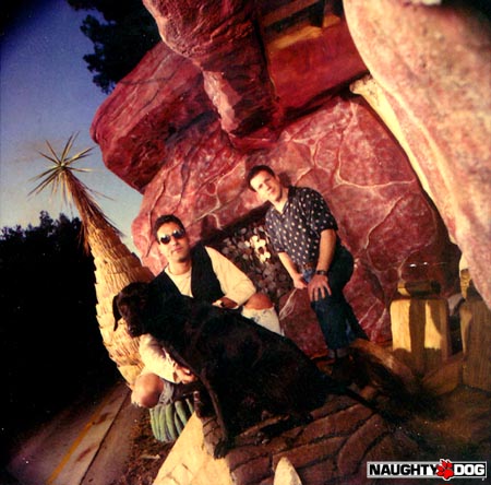 Andy: Well , Naughty consists of mainly Jason Rubin and myself . Naughty got its names from a cartoon character that Jason drew. (Andy showed me a picture of an old Naughty Dog logo). Their new logo is on their flyers. The character was created about 8 years ago.